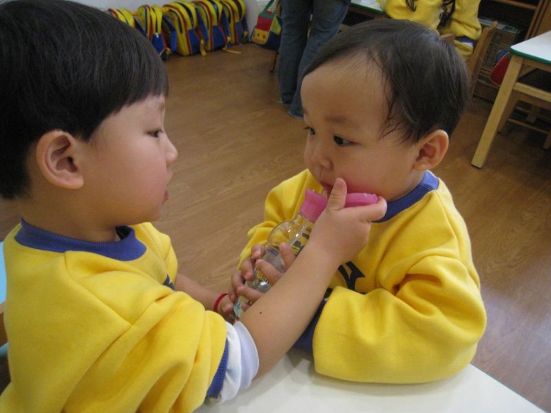 中場休息時間哥哥會照顧弟弟喝水很棒喔!