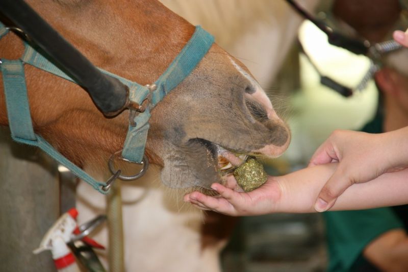 孩子們試著聞馬專用美食
