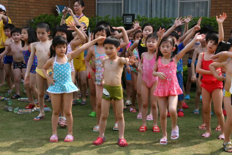 老師為孩子們換上超大T恤準備投入水中競賽