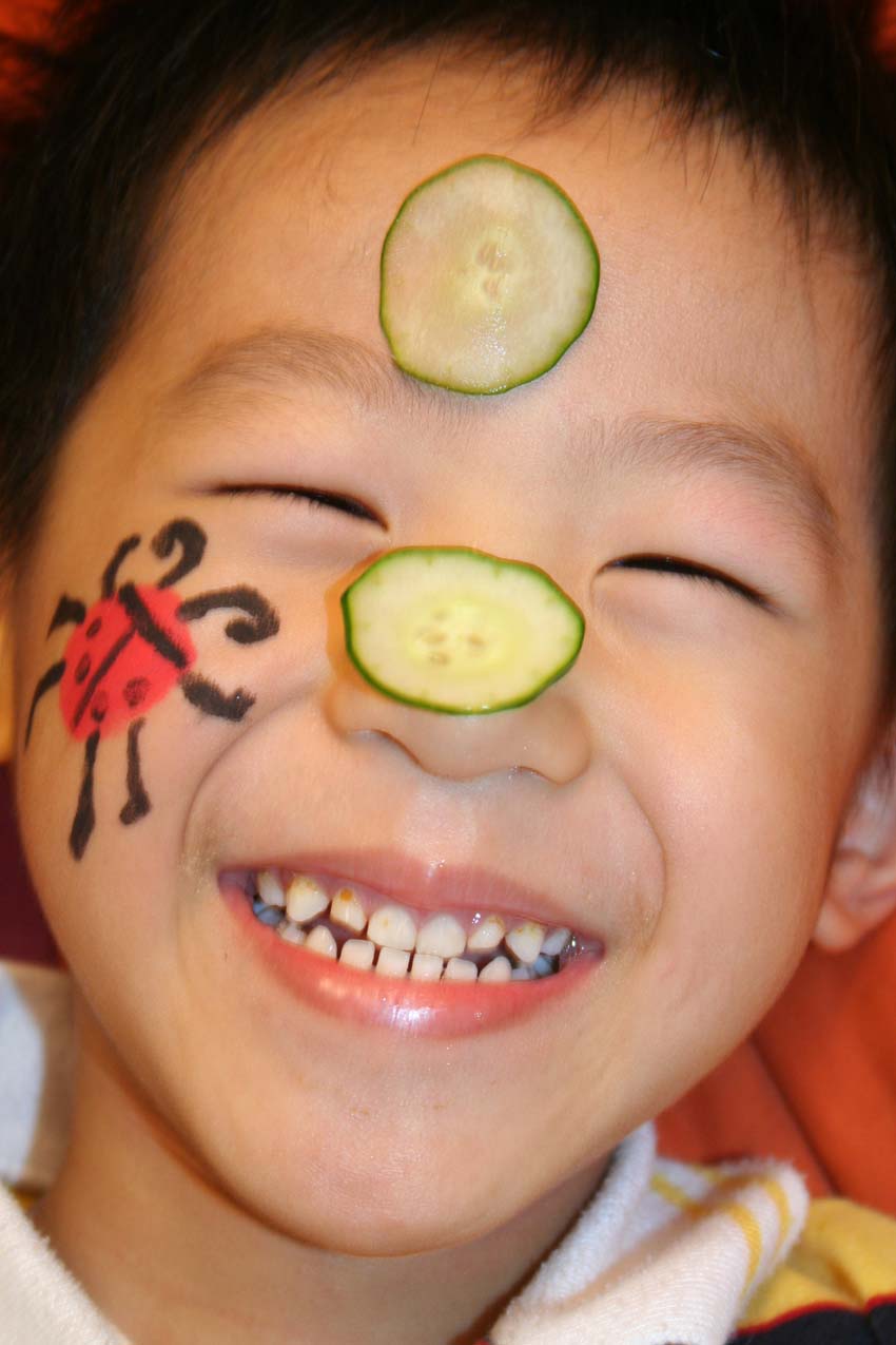 Baby班年紀小,不敢嘗試敷臉,Tiffany老師示範後請小朋友幫忙拿黃瓜