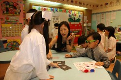 凱斯P1班老師運用各式口袋掛圖,進行師生課程互動。
