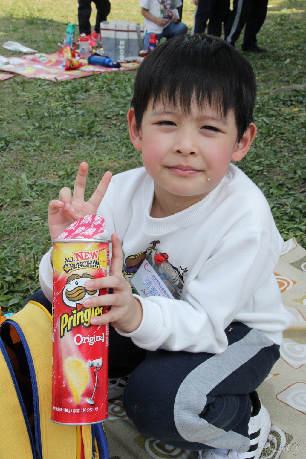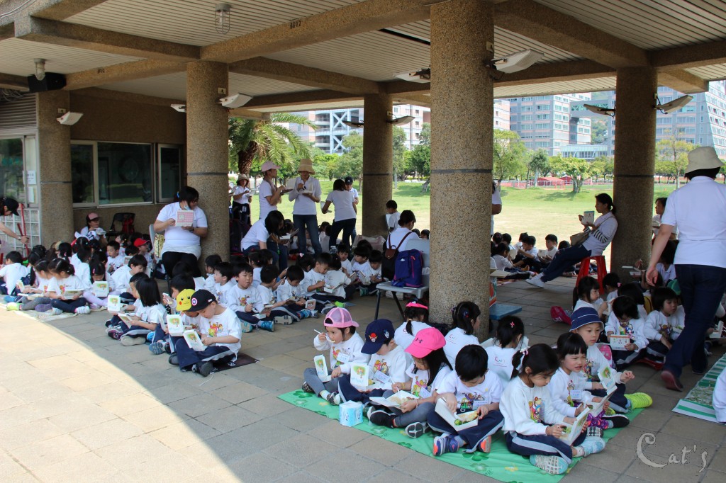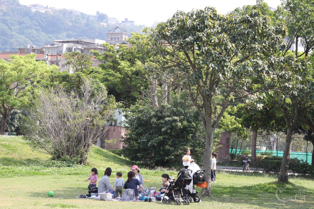 公園裡有許多的親子在草地野餐