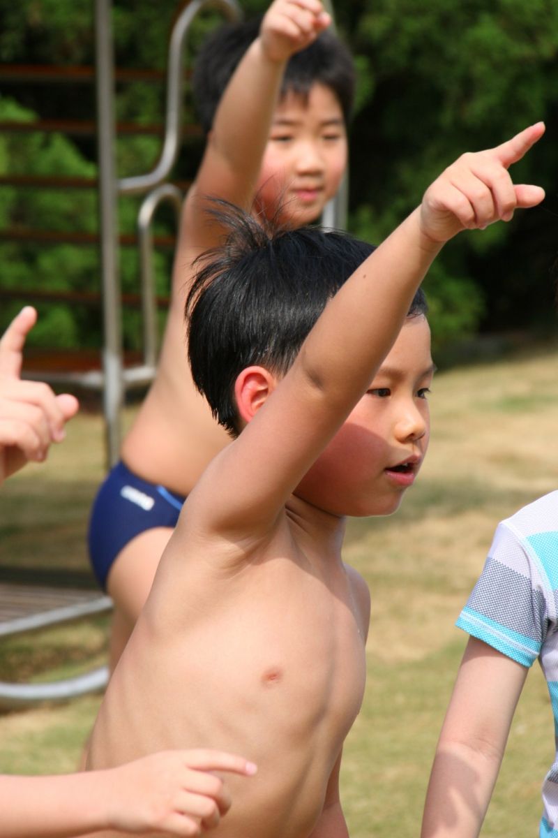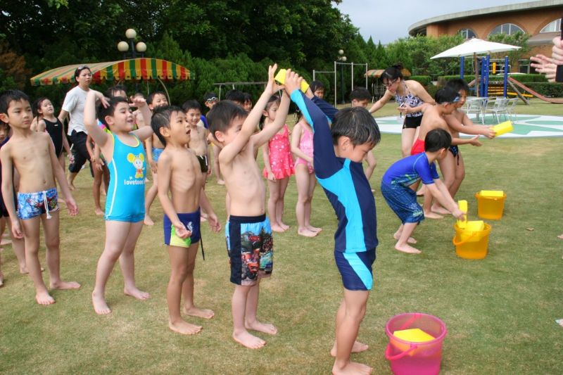 老師為孩子們換上超大T恤準備投入水中競賽